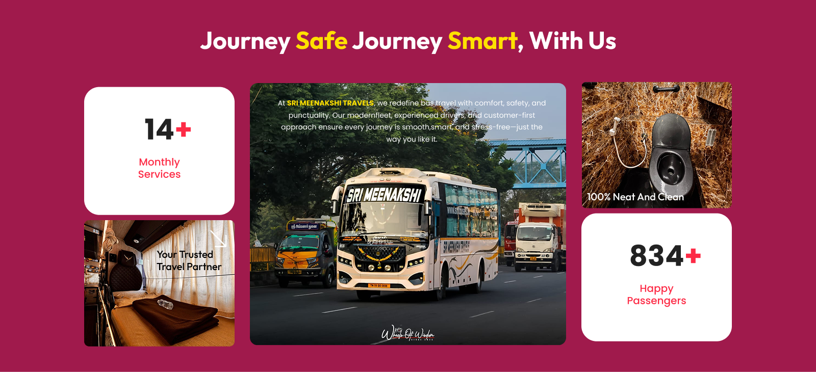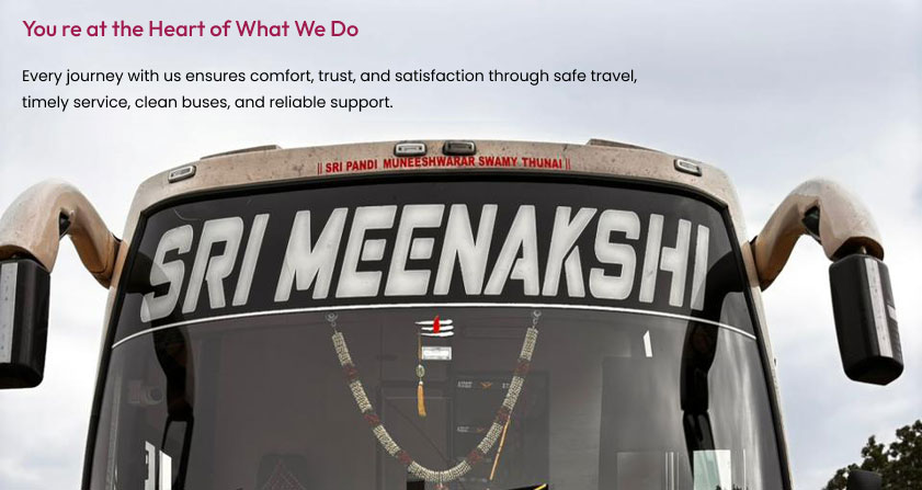 From wide, cushioned seats that offer ultimate comfort to engaging onboard entertainment that keeps you entertained throughout the ride, along with advanced safety protocols for your peace of mind, SRI MEENAKSHI TRAVELS ensures every journey is smooth, relaxing, and secure.